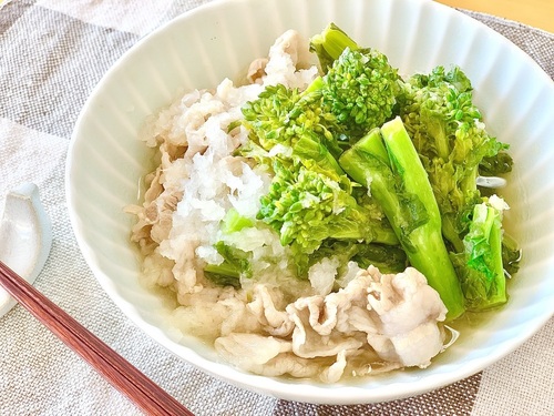 ・豚ロース薄切り肉…150g 菜の花…200g ごま油…小さじ1 豆板醤…小さじ1/2 ・【A】 料理酒…小さじ1 濃口醤油…小さじ1 片栗粉…大さじ1/2 【B】 オイスターソース…小さじ2 料理酒…大さじ1 みりん…大さじ1 砂糖…小さじ1/2